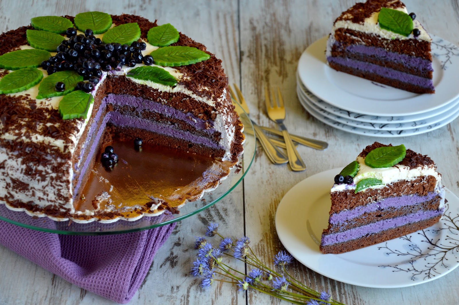 Ten pyszny i pięknie się prezentujący tort zachwyci Waszych gości. Jagody nie tylko nadają mu smak, ale również sprawiają, że krem jest pięknie fioletowy. Świetnym dopełnieniem tortu jest udekorowanie go startą czekoladą, jagodami i zielonymi liśćmi. Moje liście przygotowałam sama z masy marcepanowej, do której dodałam odrobinę zielonego barwnika w proszku.