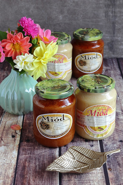 Miód towarzyszy mi przez całe życie. Już od najmłodszych lat jadałam go na chlebie, dodawałam do herbaty lub zjadałam na łyżeczce. Mimo swojej kaloryczności, to zdrowy nawyk, bo właściwości miodu mocno przemawiają za jego spożywaniem. Poza wymienionymi przykładami z dzieciństwa, aktualnie często jadam miód na naleśnikach i racuchach, dodaję go do owsianki, koktajli lub do jogurtu naturalnego wraz z wybranymi dodatkami. Możliwości jest wiele, a ja z nich korzystam. Przygotowuję również miodowe pierniczki, ciasteczka i ciasta, ale minus jest taki, że pozostaje już sam smak bez dobroczynnych właściwości miodu. Miód traci swoje właściwości, gdy poddany jest zbyt wysokim temperaturą, dlatego najlepiej kupować miody ze sprawdzonych źródeł np. bezpośrednio z pasieki od pszczelarza. Prawdziwy miód ulega krystalizacji. Jak zaznacza na swojej stronie Miodowe Wzgórze, naturalnym procesem dla prawdziwych miodów jest krystalizacja. Gdy jeszcze kupowałam miody w marketach, to czytając etykiety starałam się wybierać te, na których pisano "Produkt Polski". Przede wszystkim unikałam takich, na których pisało, że miód jest mieszanką miodów z Unii Europejskiej i spoza niej. Polecam Wam miody prosto z pasieki. Ja jestem aktualnie zaopatrzona w pasiece Miodowe Wzgórze w miody: spadziowo-nektarowe, lipowy i wielokwiatowo-nektarowy.